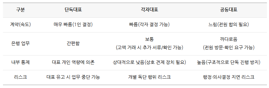 공동대표 vs 각자대표 vs 단독대표 : 계약·은행·책임에서 차이점